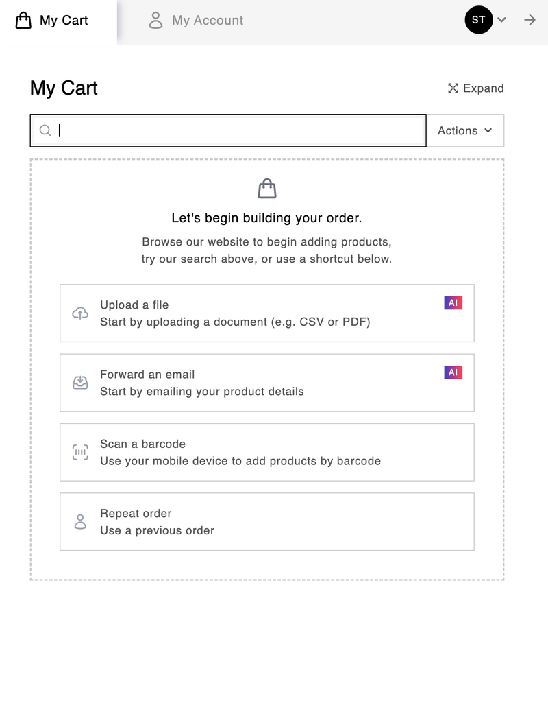 - Upload a CSV, PDF, barcode scan, or even email to instantly build your cart