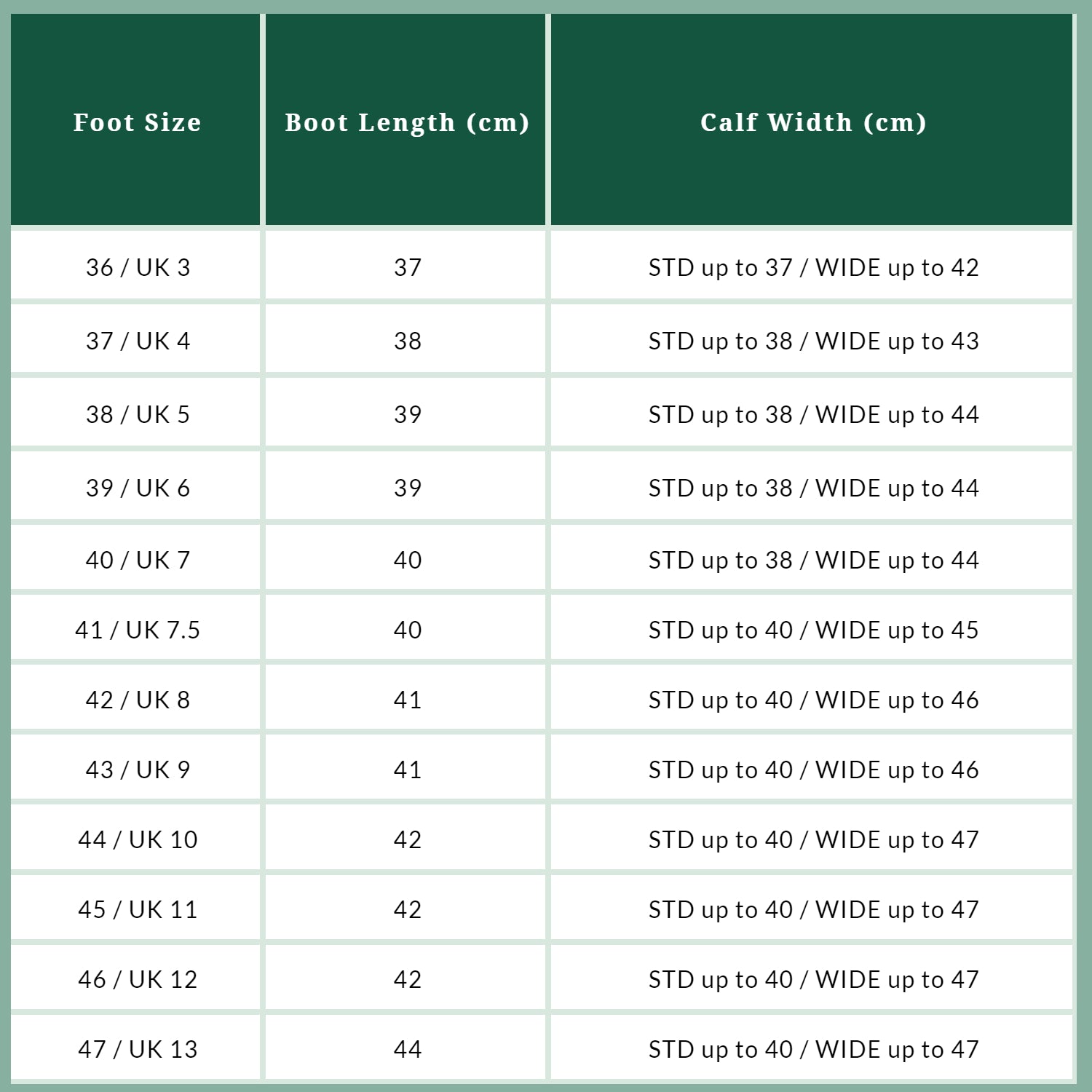 Available in two calf widths; Standard and Plus-Size Wide and in foot sizes: UK 3 Eur 36 – UK 12 Eur 46